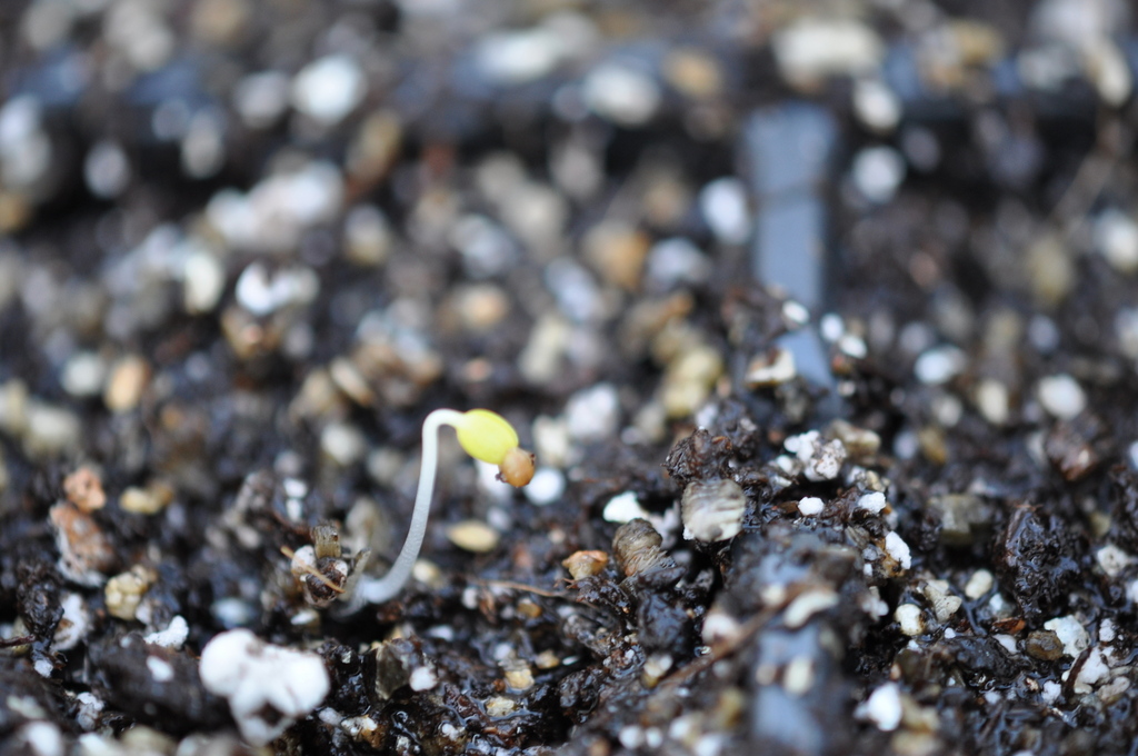 16日もやしのようにひょろひょろと発芽しました。ほかも種が割れて発根が確認できました