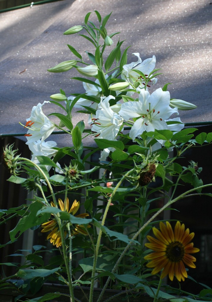 デッキに置いた、苗でいただいたカサブランカがきれいに咲きだしました。ちょうどヒマワリとコラボしてきれいです。
