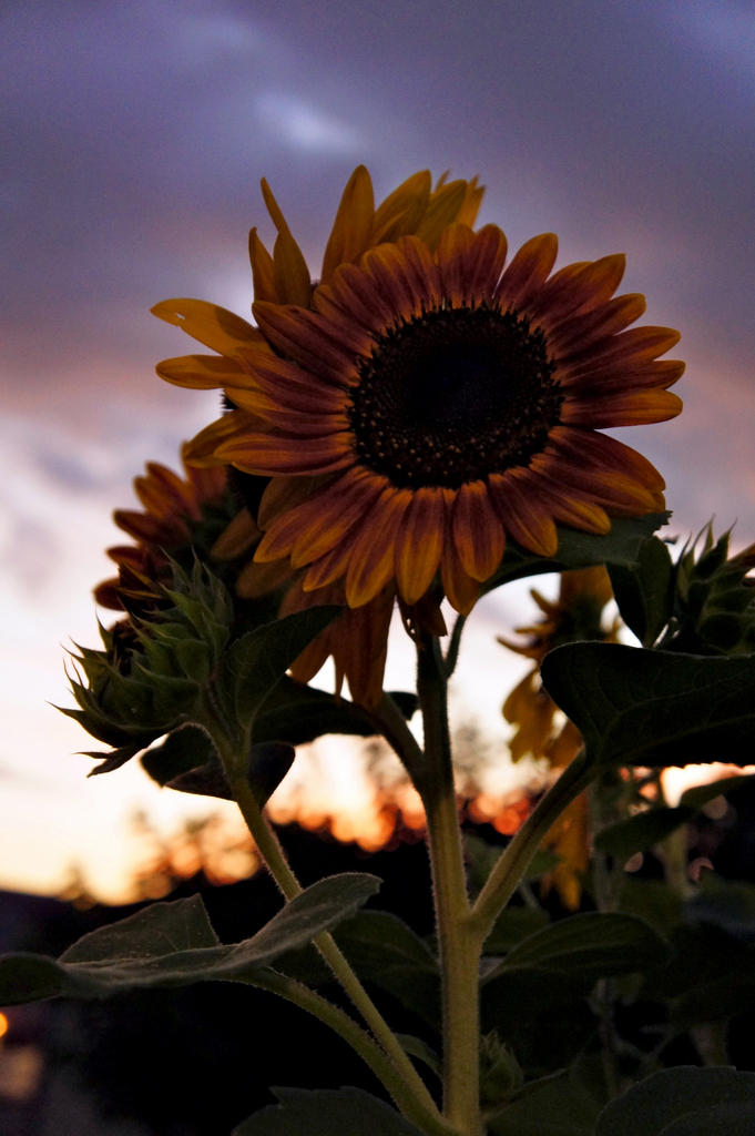 斬新な取り合わせですね。太陽の象徴のような花ヒマワリと日の落ちる夕暮れ。