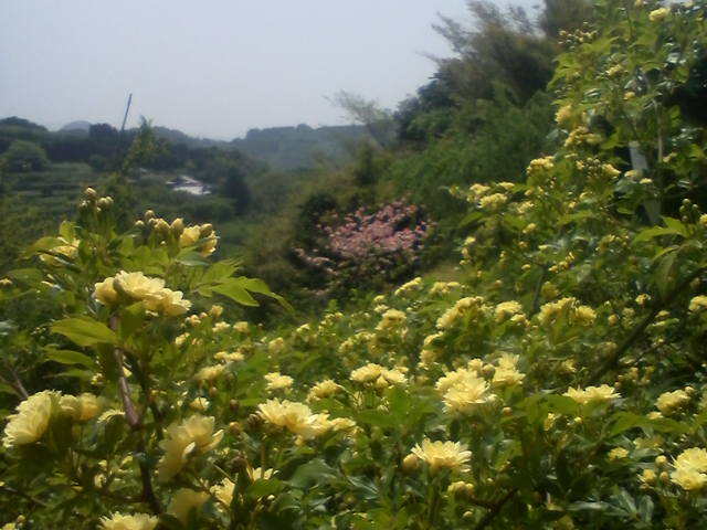 モッコウバラです。その向こうに見えるピンクの花を咲かせている木は、ハナミズキです。*携帯電話で撮影した写真なので、 画像が悪くて、、スミマセン*