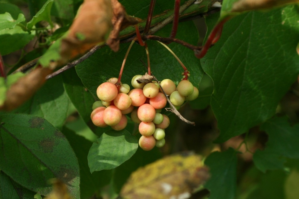 だんだん色づいて赤みを帯びてきました。真っ赤に色づくと収穫して五味子酒にするようです。