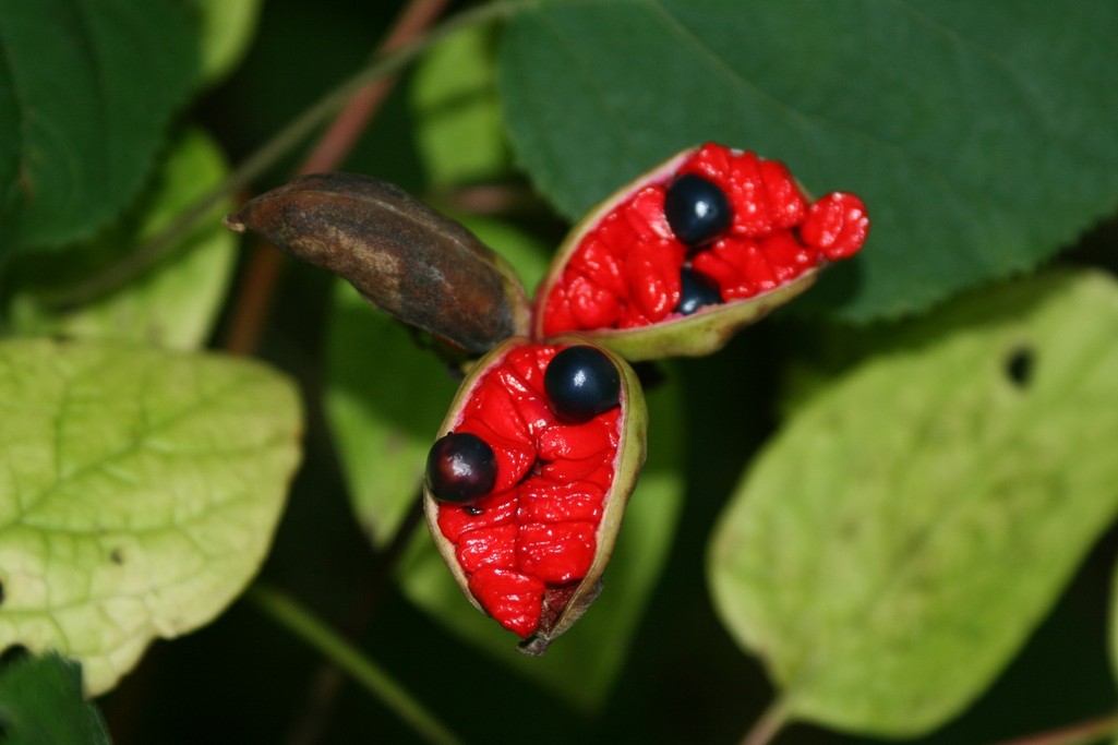 昨年もアップしましたが、これは山芍薬の種です。あの繊細な花とはかけ離れた毒々しさは驚きです。これは種の鞘がはじけたばかりの状態。青黒いのが種で、赤いのは種を保護するスポンジのようなフェイクの種です。