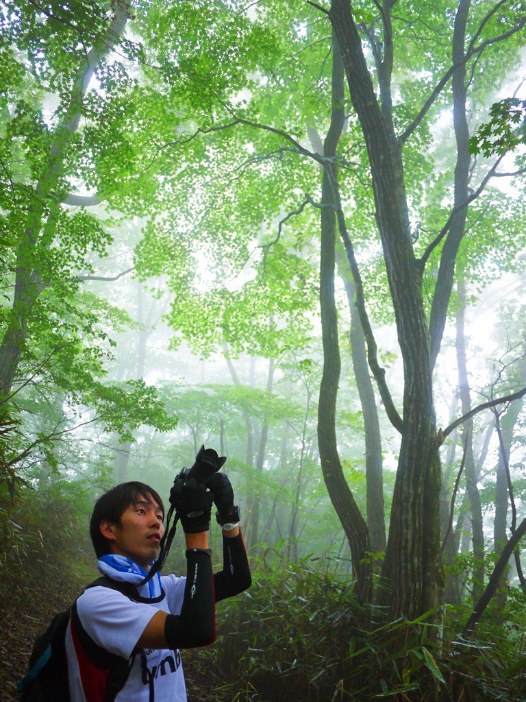 あいにくの天気の中登山(>_<) 景色は見えないですが、幻想的な風景が広がっていました(#^u^#) 下から見上げるモミジがキラキラしてすごく綺麗でした☆