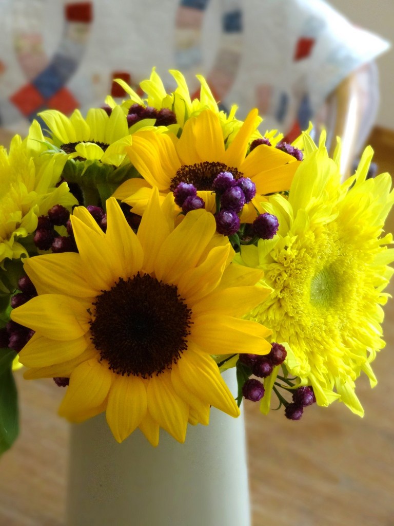 いろんなひまわりがあって楽しいアレンジですね^^ お嬢さんはきっと元気にすくすく成長するでしょう(*^^*)!!