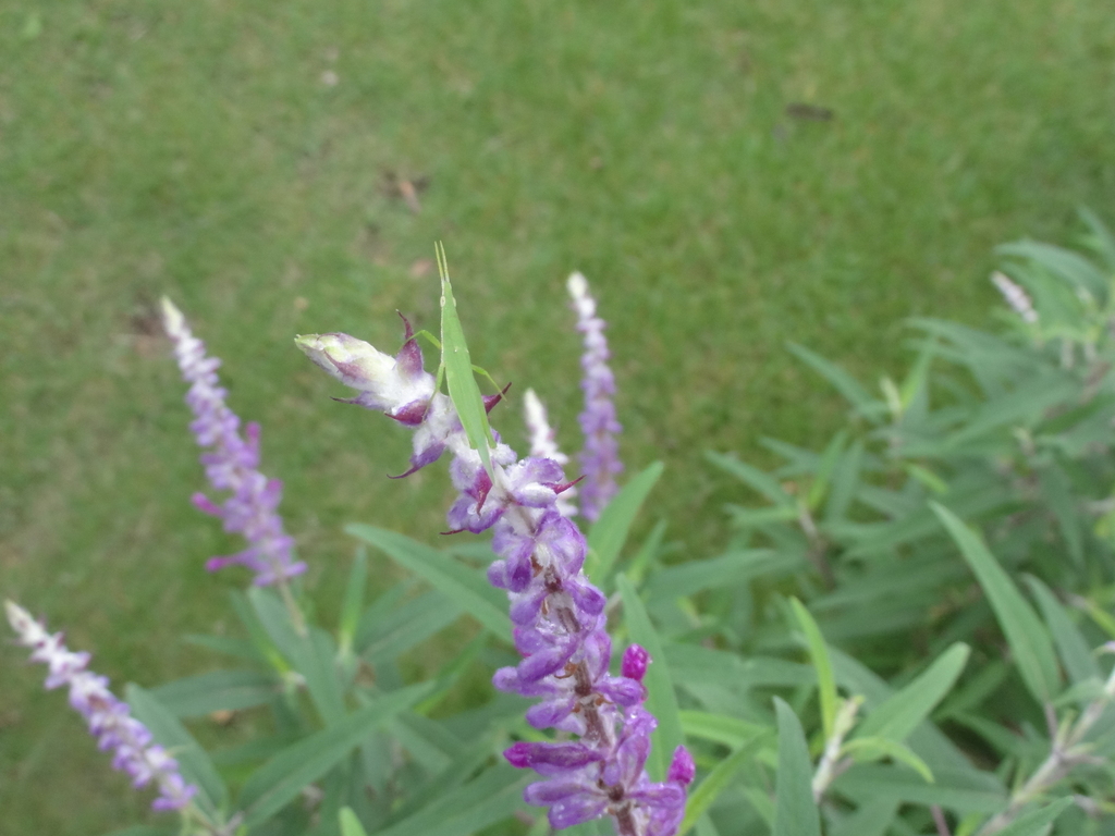 あ!このバッタ食欲旺盛でいろいろなお花の葉モリモリ食べてます。