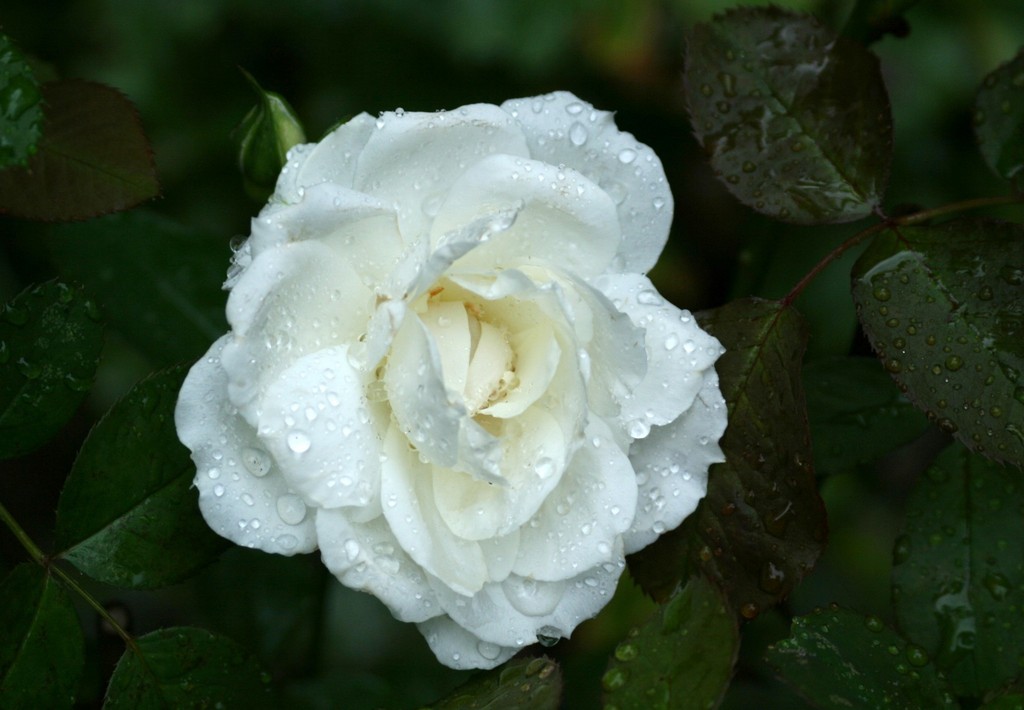 プリンセス・オブ・ウエールズ。真っ白なバラが水滴に包まれてとってもきれい。