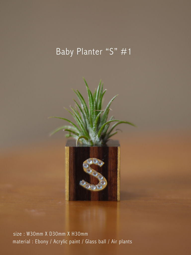黒檀で作った3センチ角の小さなプランター、イオナンタを生けました。裏面にはマグネットを貼付け冷蔵庫にもピタッ!です。