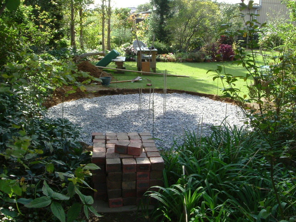 材料は近くのホームセンターから運んでもらったレンガ、スクウェア平板、モルタル、砂、砕石、それに砂岩のキット(全部は写っていませんが)。
