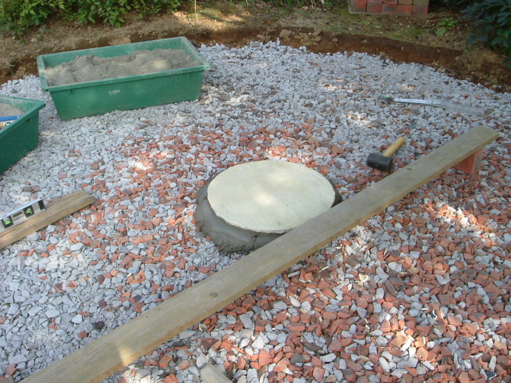 使わなくなった植木鉢なども砕いて入れています。突き固めた後いよいよセンターの固定。