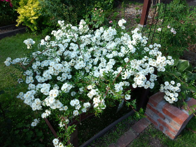 淡いピンクのバラが豪華に咲き、真ん中の真っ赤なバラと互いがひきたてあって素敵ですね