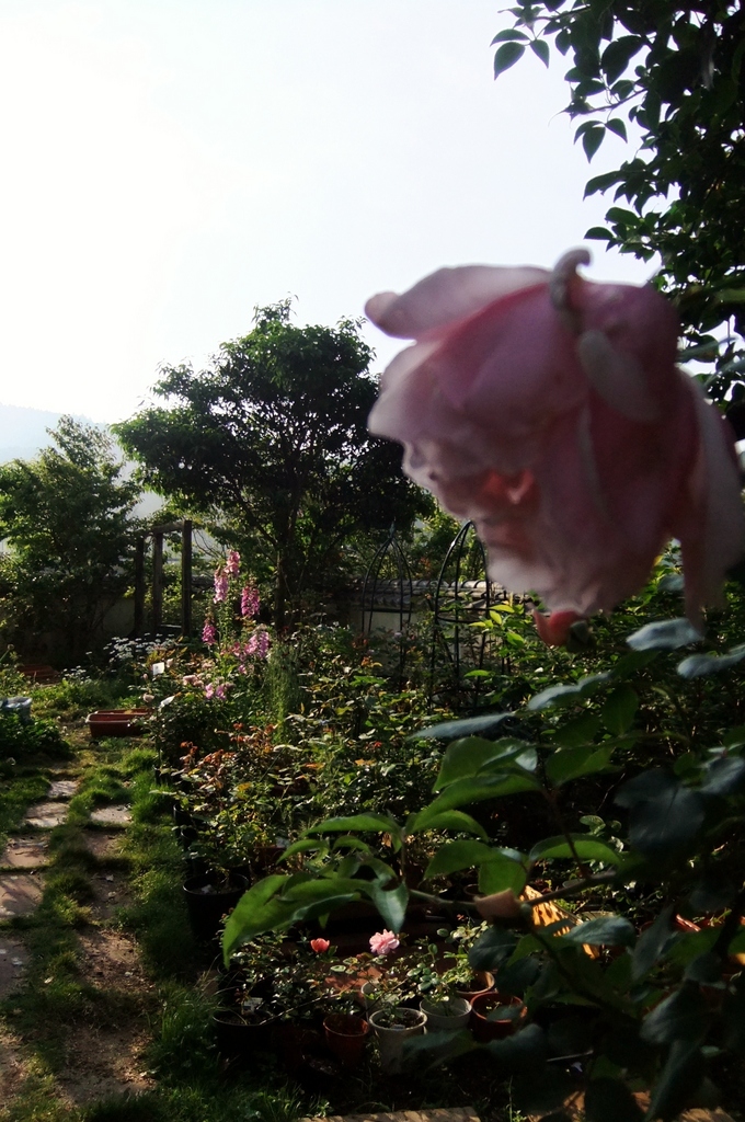 主にバラに合わせる花苗や挿し木を育てています。コンパニオンプランツはほとんど種から育てます。 1輪だけ見えるバラはアルベルティーヌです。