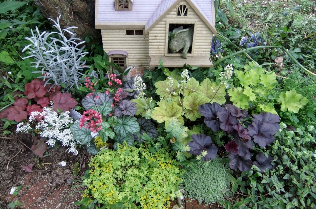 色とりどりのヒューケラの中にあるラビットちゃんのお家が可愛い~