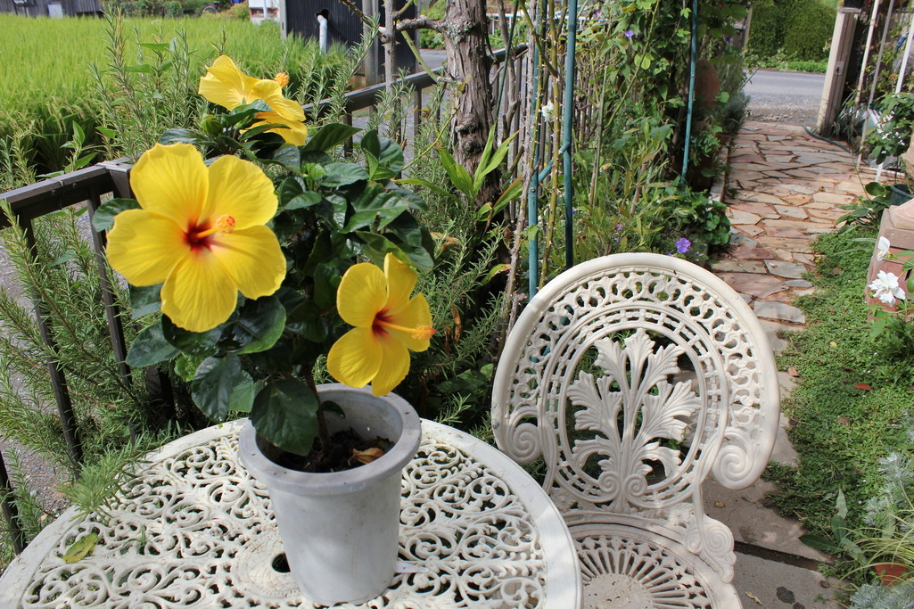 真夏に咲く花が少ない中で、ハイビスカスの大輪ががテーブルを飾ってくれました