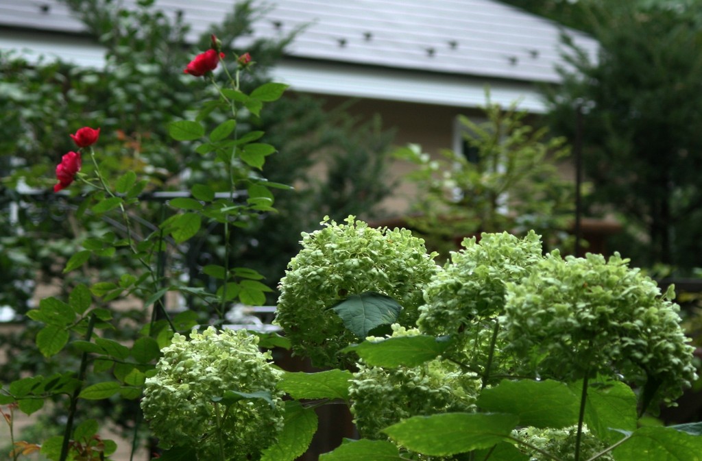 美しいアナベルのグリーンの中、真っ赤のばらが差し色になっていて素敵ですね!