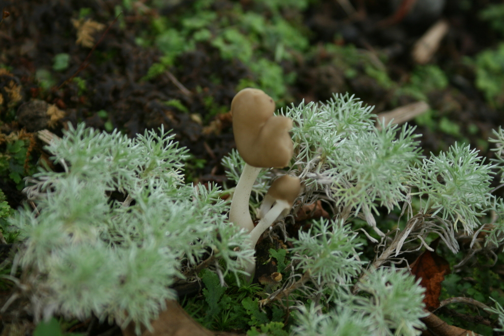 銀葉カゲロウ草の間からまるでシメジの様なキノコが顔を出していました。名前はわかりません。