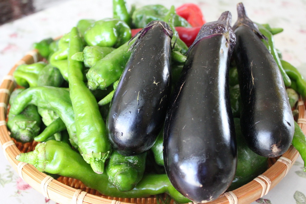 台風前に収穫した野菜です。ピーマン、福耳ピーマン、しし唐、茄子の取り立てです。