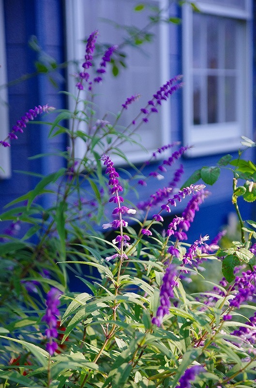 ブルーの建物にセージの紫がよく似合って美しいですね!