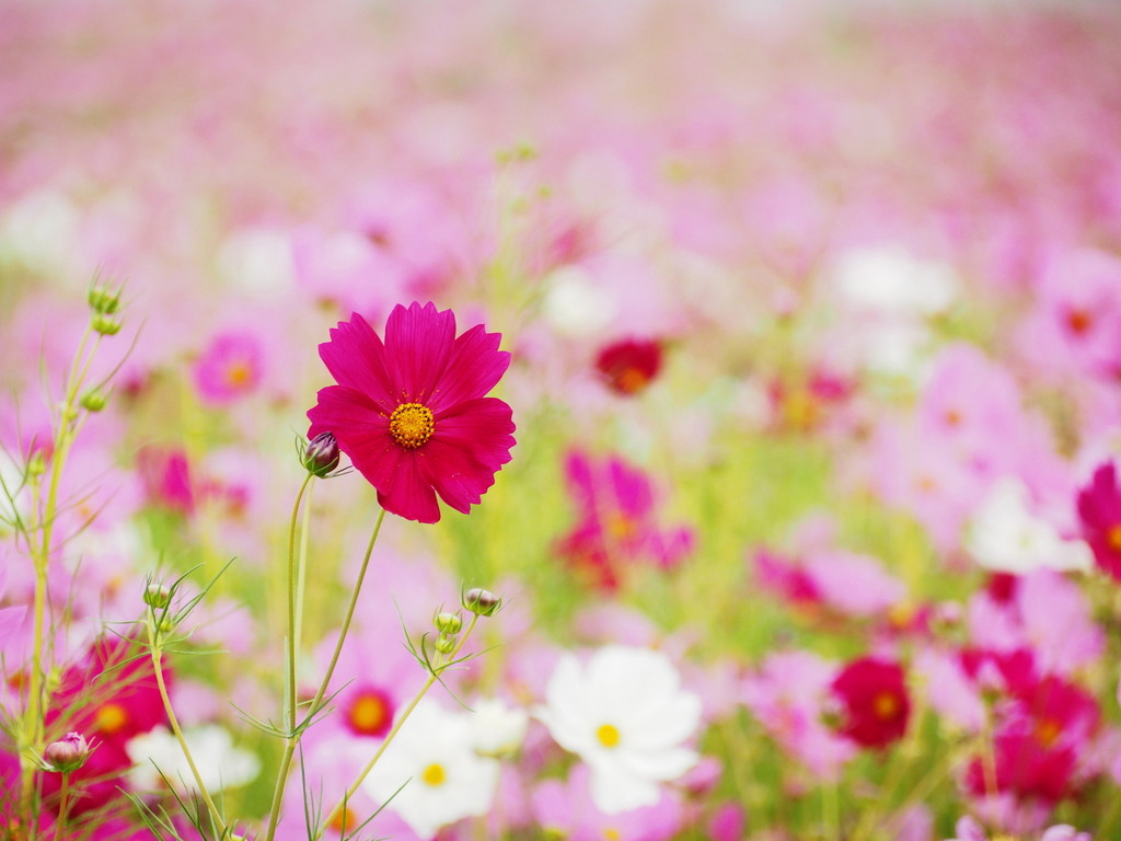 一輪だけにピントが合い広大な花畑が表現できた美しい写真ですね。