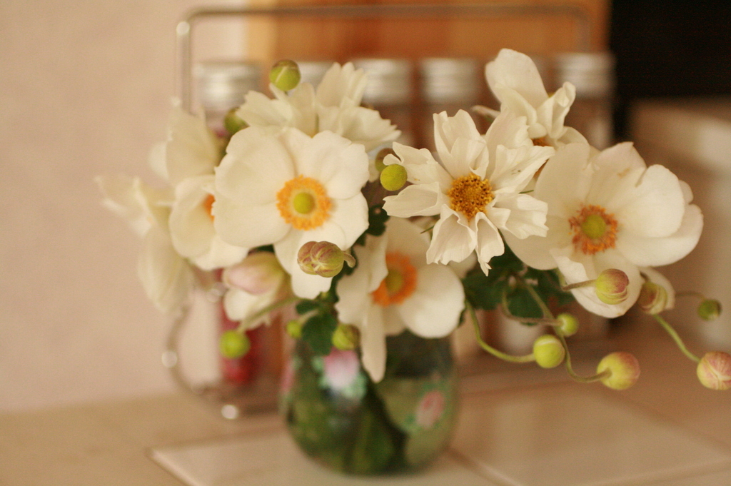 八重咲きコスモスに白いシュウメイギク、秋の清楚なとりあわせですね(*^^*) 可愛い♡