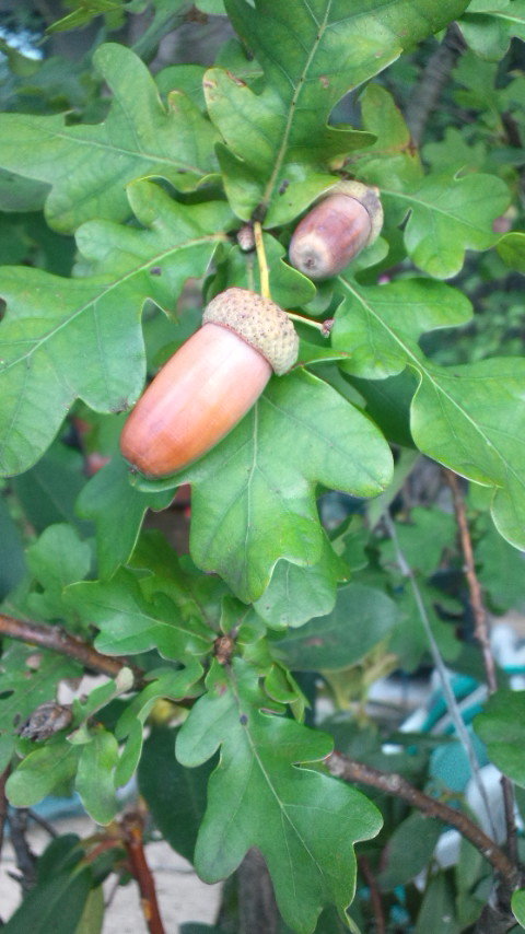 イギリスならは、春の芽だしのころはライトグリーンでとても美しいです。夏は深いグリーンになり、秋は写真のような大きなどんぐりがなります。長さ3センチ程もあるどんぐりは存在感抜群です。葉の形が変わっているので良く『何の樹ですか』とたずねられます。