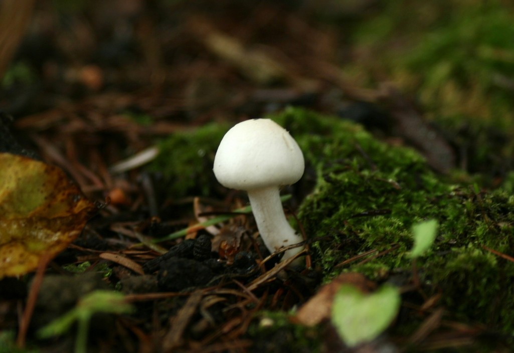 苔の間から3cmほどの小さな真っ白いキノコの赤ちゃんが顔を出していました。