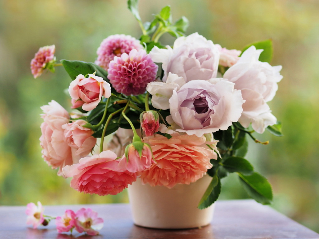 今の時期でもバラやダリア等が咲いて庭の花だけでアレンジできるなんてお幸せですね。