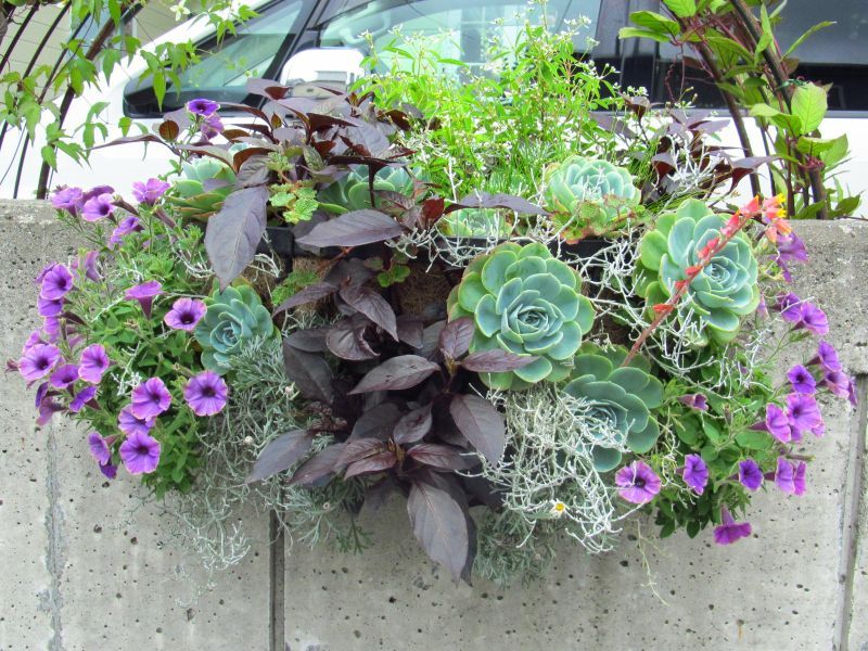 エケべリアと葉物そして、紫を差し色にした、とてもセンス良い寄せ植えで素敵ですね。