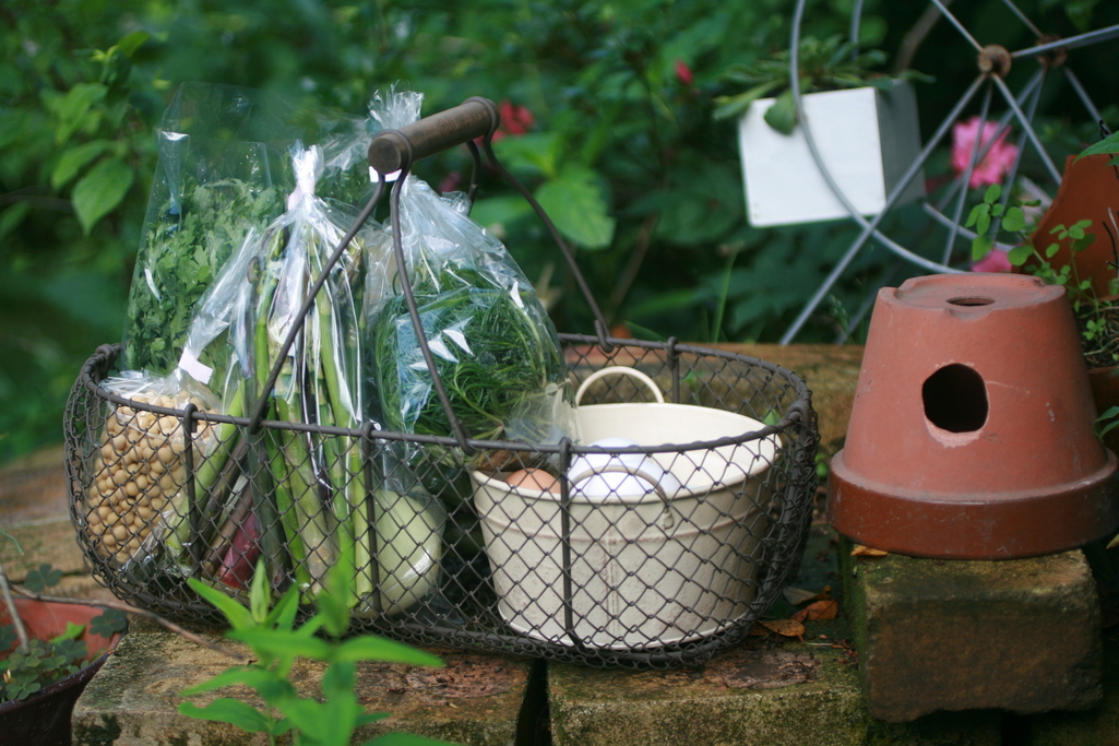 わあ~、いいなぁ。うちも近ければそのかごでどどさんに配達に来てもらいたいな。で・でも青い卵ってなんですか?私見たことないんですけど、卵はにわとりとウズラしか知りませ~ん。それにその隣の穴のあいた植木鉢は何ですか?やっぱりとっても気になります、どどさんち。