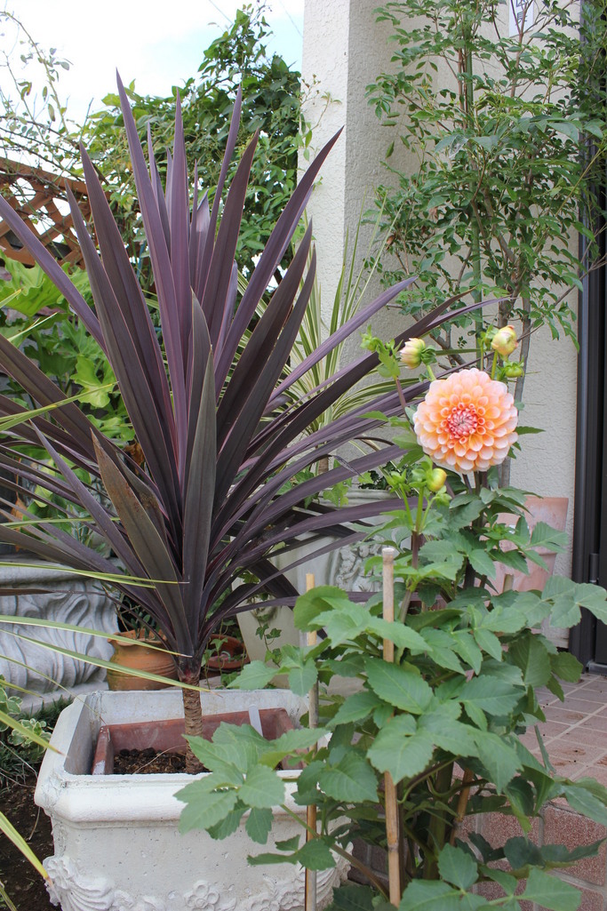 我が家にはじめてのダリアです。一目惚れの子を玄関先の銅葉ニューサイランの横に置いてみました。ピッタリの指定席を見つけました。