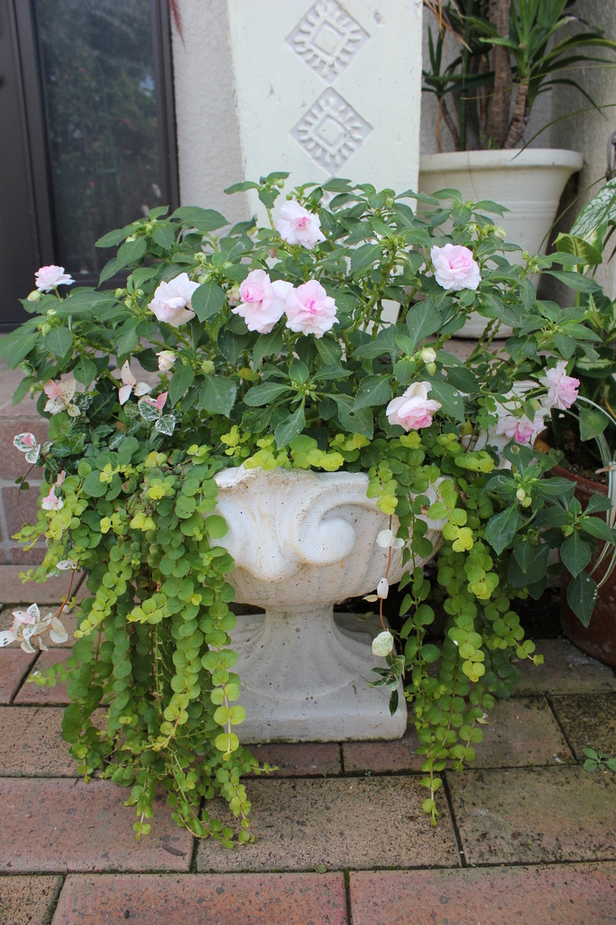 ばら咲きインパチェンスの周りに白く見えるのが初雪カズラで下に垂れている黄緑がリシマキア・オーレアです。