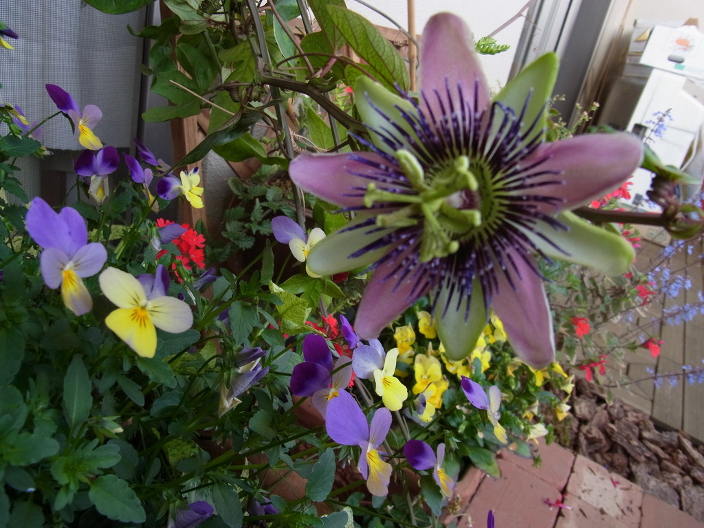 色とりどりで、楽しくなるベランダですね^^ トケイソウが花に囲まれたおやつの時間を告げてるみたいです(*^^*)!