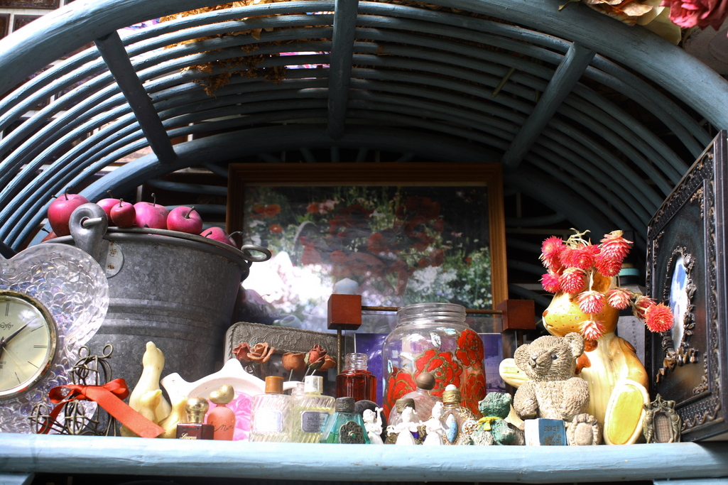 見るたび関心するコーナー。友達はリユースの達人です。ミントグリーンの籐のシェルフは素敵な形をしています。