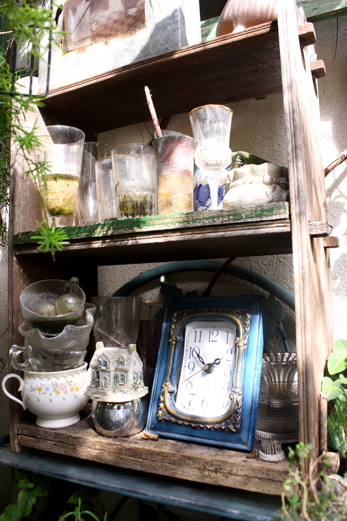 普通、庭には置かないような物も置いてあっていつもハッとさせられます。木の棚様のものは、私が拾ってペイントしてしばらく使った後捨てたもの。リユースのまたリユース。ここにきて活かされました。