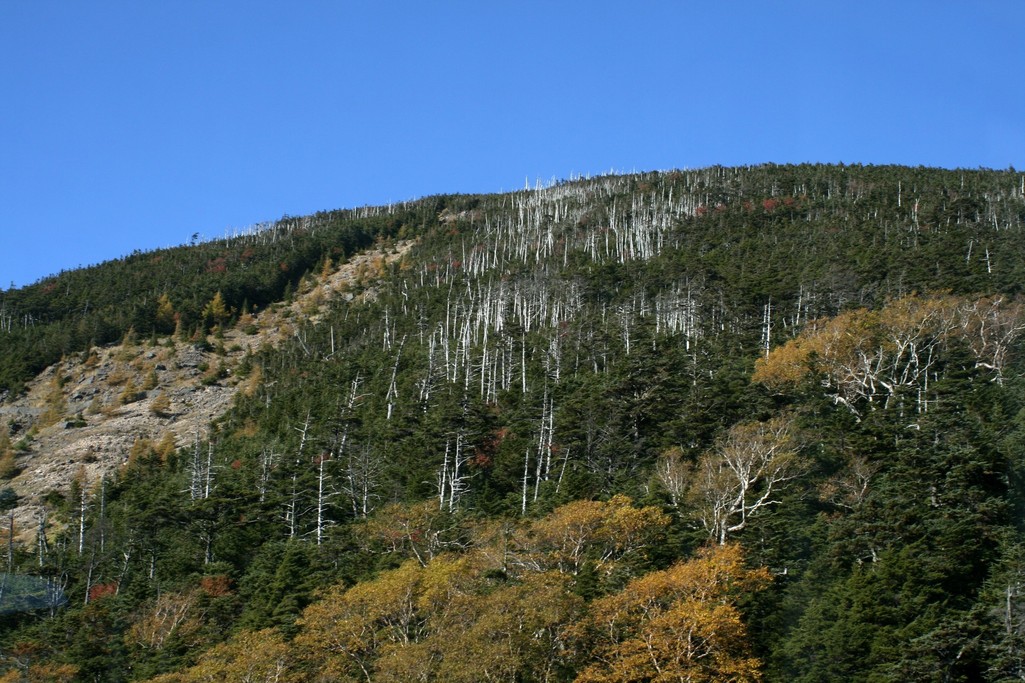 このあたりは、山の木々が縞模様に枯れており縞枯山とよばれています。なぜこのようになったのか原因は不明とのことです。