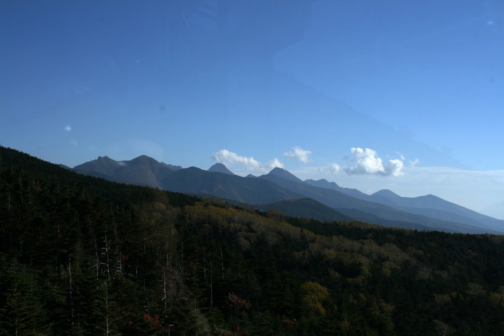 白駒の池からの帰りに、ピラタスの丘の北八ヶ岳ロープウエイで坪庭まで登りました。これはロープウエイのゴンドラから南八ヶ岳連峰を見たところです。
