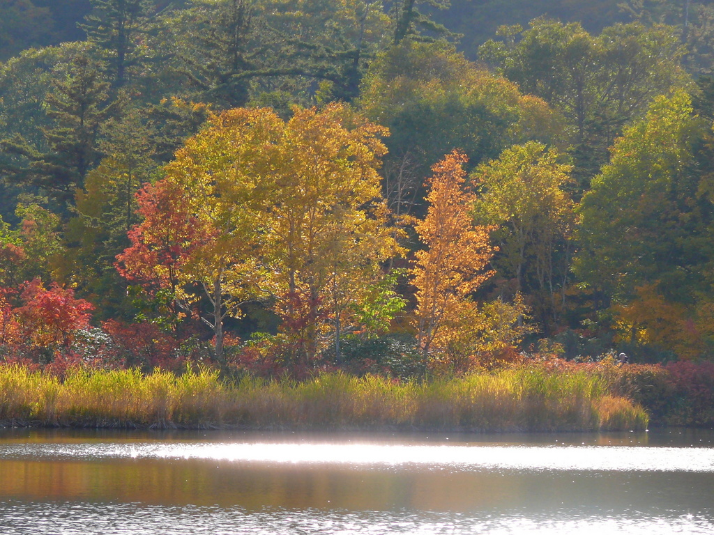 自然が美しいですね。湖面の光が紅葉にエッセンスを加え、さらに輝きの風景を作りあげています。