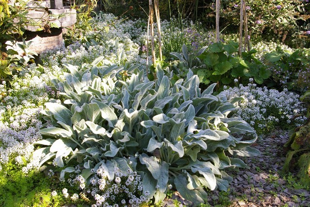 ラムズイヤーとアリッサムの群れにさす木漏れ日が素敵です(*^^*)