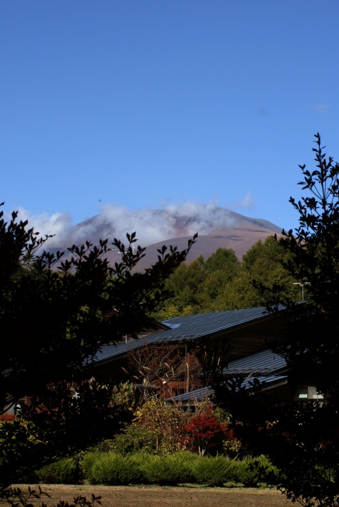 近くの公園から見た浅間山。手前のドウダンツツジが赤く紅葉してきています。