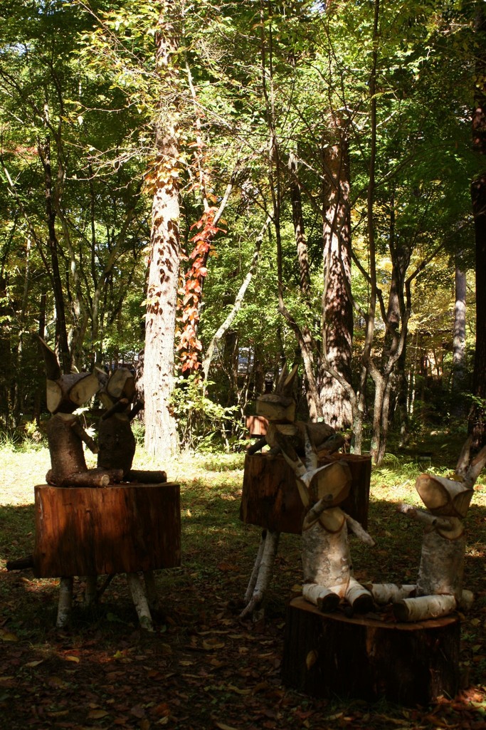 ホテルの庭に丸太で作ったウサギさんが置いてありました。その向こうには紅葉したツタウルシが木にまとわりついています。