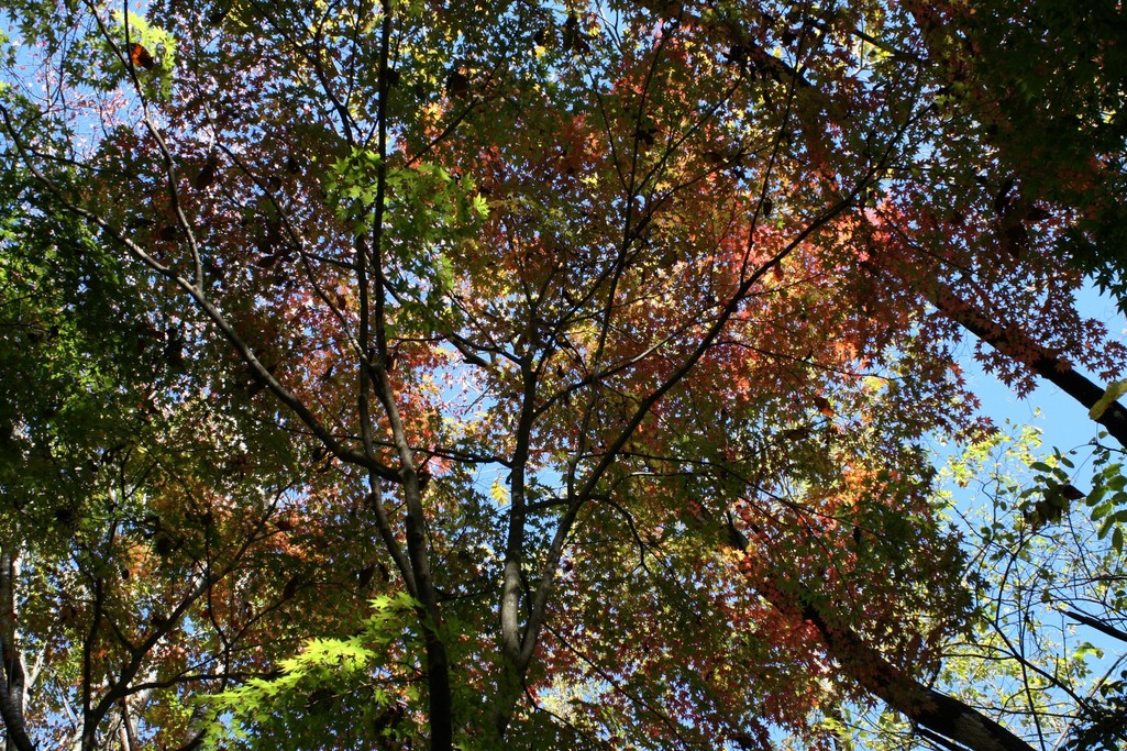 頭の上には紅葉し始めたモミジの色のグラデーションがきれいです。