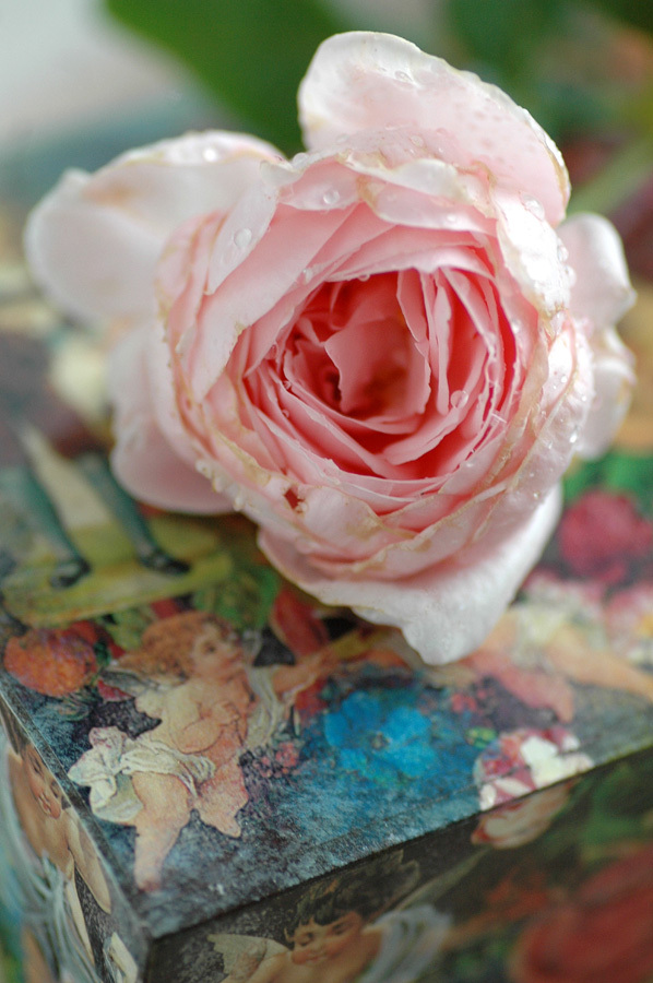 下のボックスのメルヘンチックな柄とバラが織りなす色彩が素敵です。