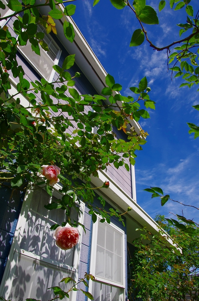 青空と白い家に咲くピンクの秋バラ・・・見事ですね。