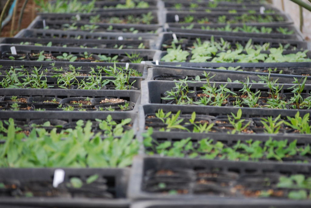 畑に花苗が並び始めました。寒さに強い丈夫な苗に仕上げるため、ビニールハウス内ではなく外でトンネル栽培で越冬します。