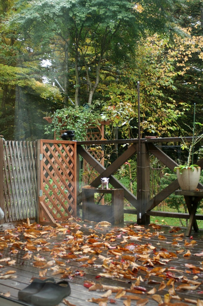 今朝は雨。デッキの上には落ち葉がたくさん雨に濡れていました。