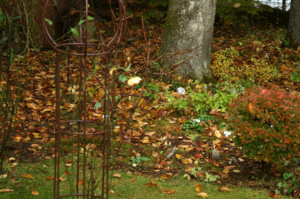 庭のコブシの大木の足元の山野草コーナーも枯葉が覆っています。