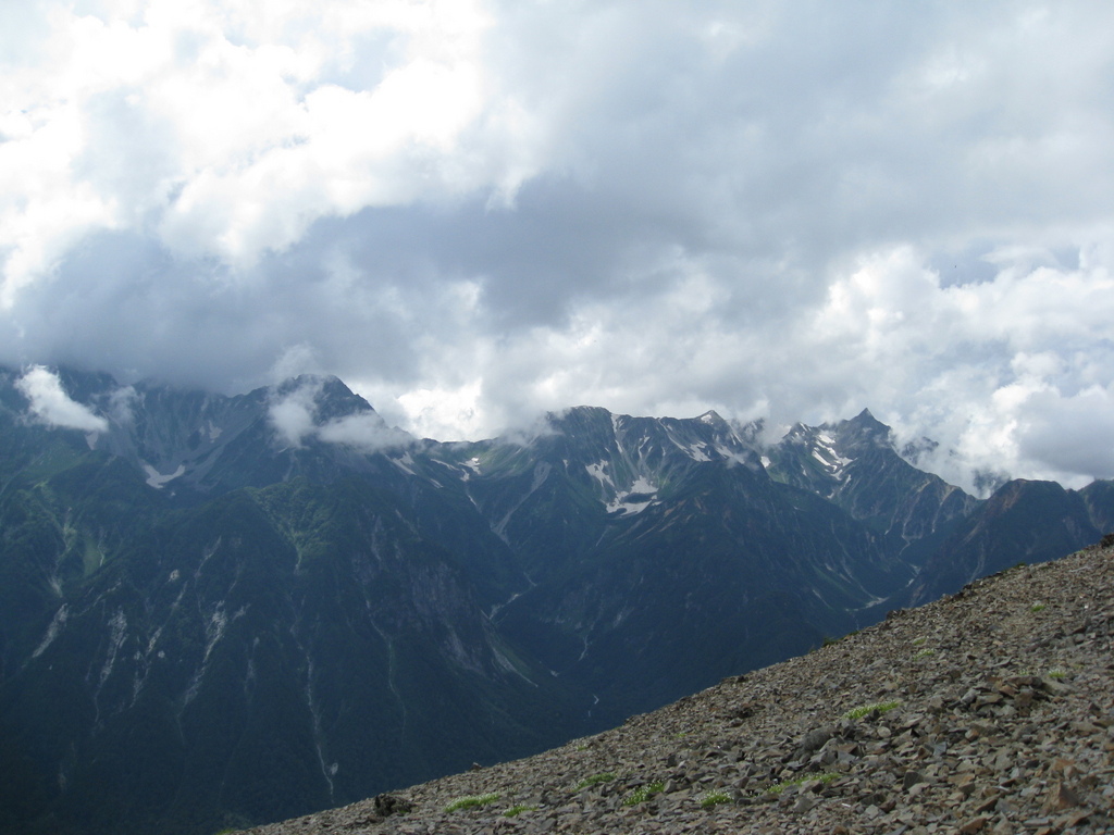 蝶が岳山頂から・・雲の間から槍ヶ岳が見えるのを・・・じっと待ちました(笑)