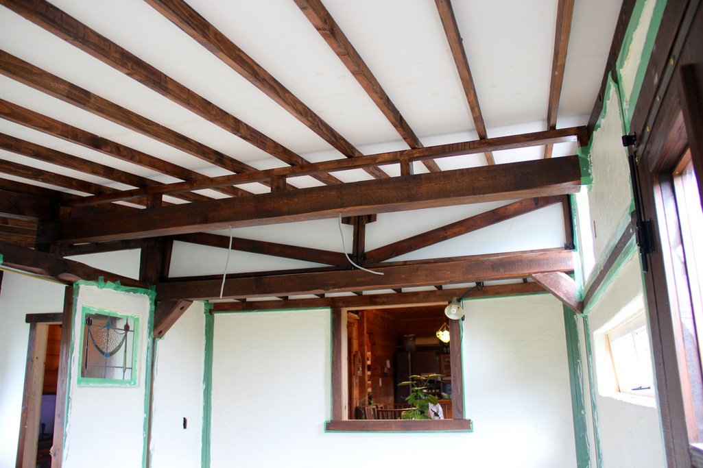 わんちゃんのお部屋の天井、白い漆喰の壁に、濃いアンティーク調の色が落ち着きます。わんちゃんが、羨ましい…天井部分に物入れも、あります。明るいお部屋!