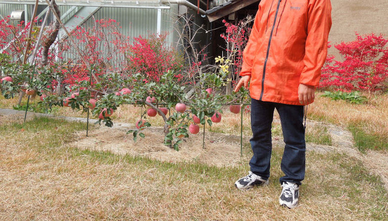 上に伸びる枝は剪定して仕立てるようですので、サイズはほぼこのままでしょうね。リンゴ栽培している方が定期的に必要なお世話してくださっているそうです