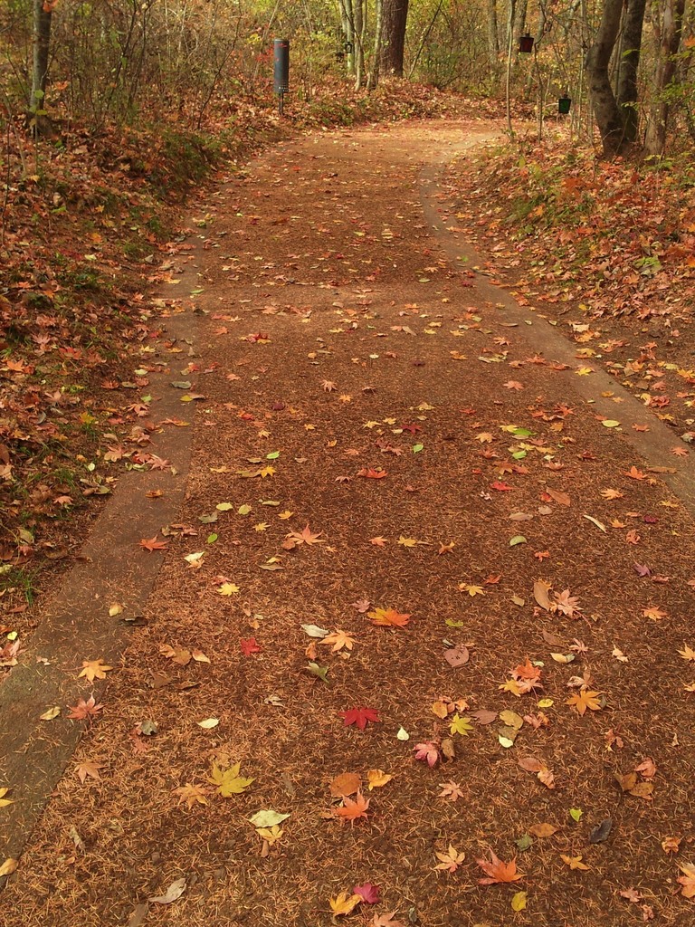 湯川沿いの遊歩道には、モミジの落ち葉が模様のように散らばっていました。