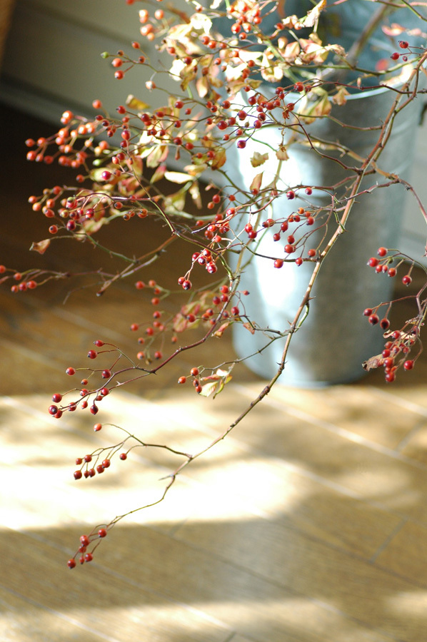 枝の流れが生け花の流派にのっとって活けたローズヒップに見えますよ。